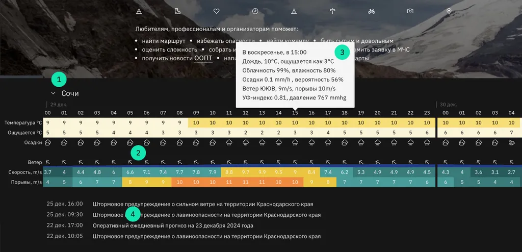 Данные в этом разделе обновляются каждые 5 минут, чтобы вы всегда были в курсе актуальной обстановки. Информация собирается из более чем 100 источников, включая все отделения МЧС по всей России. Этот блок помогает вовремя получить важные предупреждения и обезопасить свои походы.