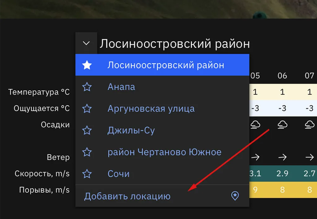 Все просто: нажмите на галочку в заголовке виджета погоды, и перед вами откроется выпадающее меню. Выберите пункт «Добавить локацию» и укажите интересующее вас место в открывшемся окне. Всего пару кликов — и новое место добавлено в ваш список.